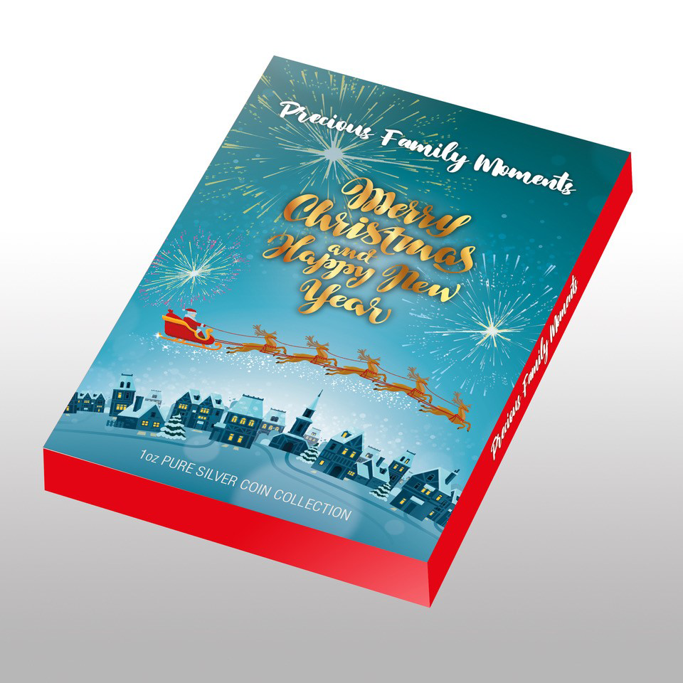 In the middle of the reverse is a high resolution printed “Christmas Santa Giving Gifts” image. Around the image is a circle of elements which appears on each of the coins. At the bottom the series name “PRECIOUS FAMILY MOMENTS” is written.