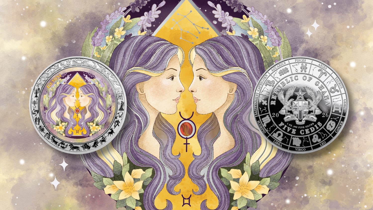 PopCoins® is proud to present Gemini as part of the elegant Zodiac Aquarelle Coin Series, a refined artistic interpretation of the zodiac through soft watercolor design. Minted in 1 oz of pure silver with a 40 mm diameter and a flawless proof finish, this issue features a high-definition printed depiction of Gemini in delicate pastel tones. The harmonious composition reflects the dual nature of the sign through symmetry and balance. Issued as legal tender by Ghana, the obverse displays the official Coat of Arms framed by the full zodiac calendar. A graceful blend of astrology and fine art, this coin is a perfect addition for collectors and zodiac enthusiasts. Available now at distributors worldwide.
