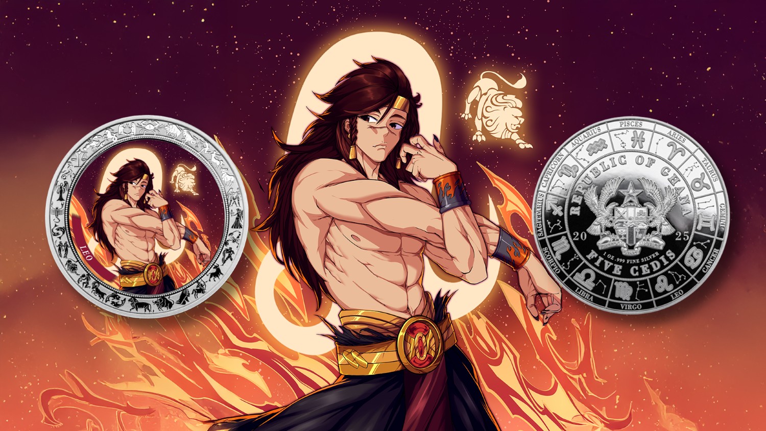 PopCoins proudly presents the radiant Leo zodiac coin, the fifth chapter in the vibrant Anime Zodiac Coin Series. Minted in 1 oz of pure silver at 40 mm with a brilliant proof finish, this release showcases a bold anime-style lion basking in cosmic light. The surrounding zodiac symbols add depth and harmony to the composition. The obverse displays Ghana’s Coat of Arms encircled by the full zodiac calendar, emphasizing its official status as legal tender. A striking collectible made for those who shine brightly — available now through global distributors.