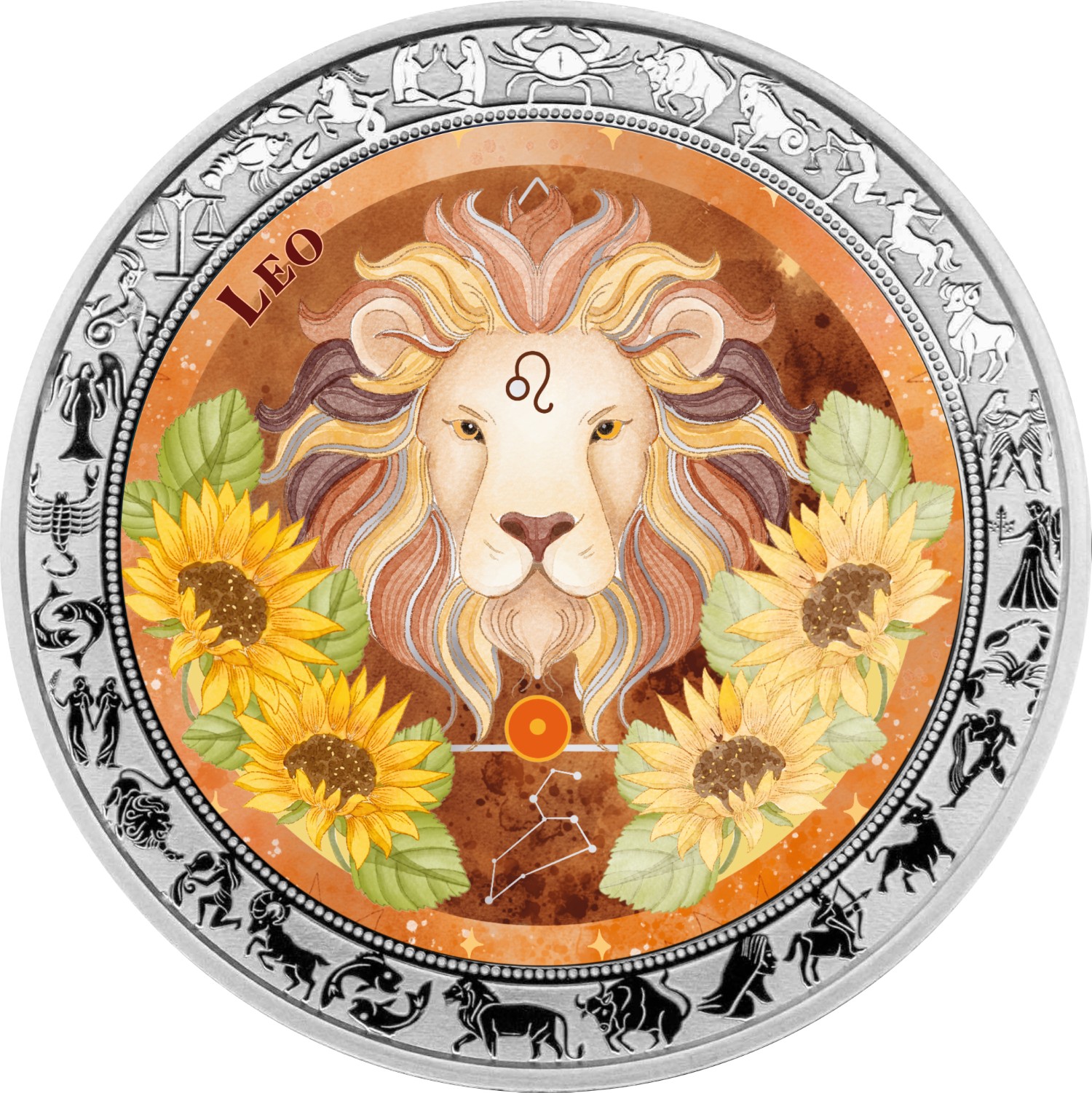 The reverse showcases a vivid, full-color aquarelle depiction of the Leo zodiac sign, centered around a majestic lion portrayed with flowing, stylized detail. The name “Leo” is incorporated into the design. Encircling the composition is a ring of all twelve zodiac signs, finely rendered to complete the celestial theme.