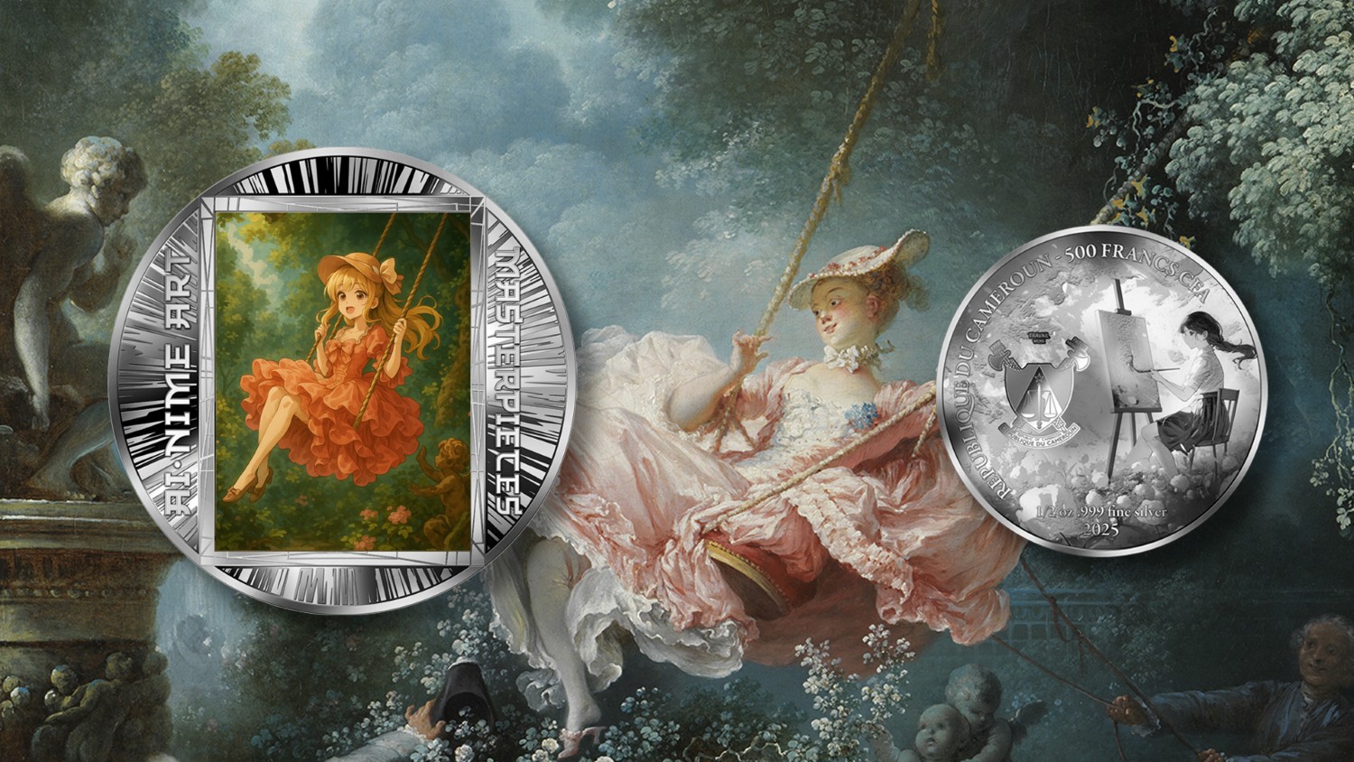 In the center of the reverse, within an intricately minted wooden-frame motif, is a vivid, full-color anime interpretation of The Swing by Jean-Honoré Fragonard, captured in remarkable detail. Elegantly positioned on either side of the frame are the inscriptions “AI•NIME Art” and “Masterpieces.” Surrounding the central framed artwork are beautifully stylized abstract elements that enhance the composition and give the coin a distinctive modern yet classical appearance.