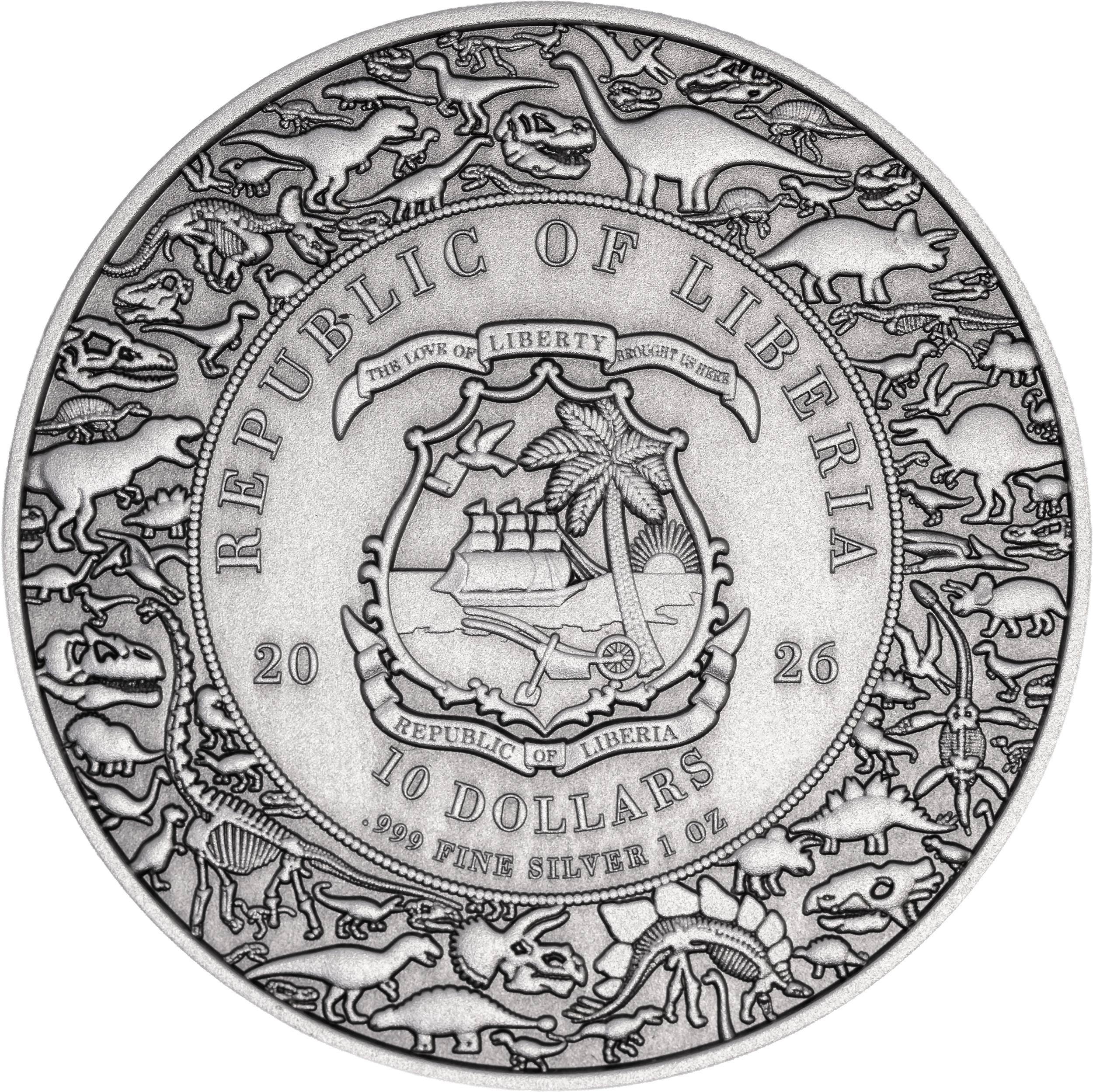The obverse side of the coin features the coat of arms of the Republic of Liberia, surrounded by various dinosaur motif icons. The coat of arms includes the inscriptions: “REPUBLIC OF LIBERIA” (the issuing country), “2026” (the year of issue), and “10 DOLLARS” (the face value).